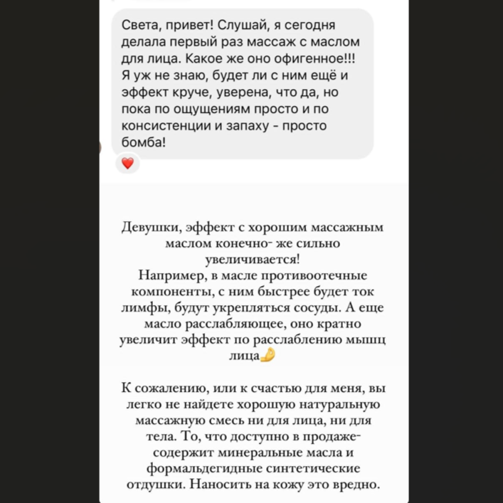 И даже специалисты по массажу лица очень редко имеют у себя в арсенале действительно грамотно составленные смеси масел, которые отвечали бы ряду требований: подходили любому типу кожи, не забивали поры, не вызывали высыпаний и воспалений, были бы натуральными и уж точно большая редкость найти продукт с настоящими эфирными маслами. Массажное масло окажет расслабляющее действие и на психику, и на мышцы, быстро будет снимать отечность. Вы получите гораздо бОльшую эффективность от процедур, если будете его использовать. Также это маслице можно будет использовать и в других целях, например, для волос.