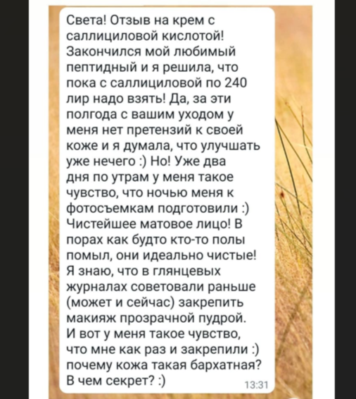 Содержание саллициловой кислоты в креме не высокое (1%), что делает возможным применение его и в летнее время. Единственно, порекомендую его использовать в качестве ночного или не выходить на открытое солнце в течение нескольких часов после его нанесения.