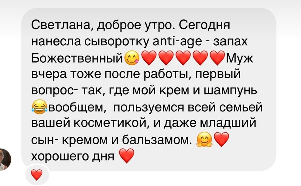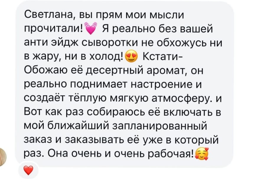 Сыворотку покупать очень выгодно, поскольку она делает любой ваш уход «трансформером». Например, вам не нужно отдельно покупать зимний крем для лица, вы просто добавляете побольше сыворотки в тот, который у вас уже есть. Или, например, не нужно стараться домазывать плотный крем, когда уже погода поменялась и хочется более легкого - вы просто начинаете меньше и реже наносить сыворотку. Или, если вдруг внезапно поменялись погодные условия (холодный или горячий ветер), и несколько дней кожу прям сушит- вы тут же решаете этот вопрос тоже сывороткой. Ну и конечно, имея сыворотку, вам по сути не нужно брать дневной и ночной крем. Вы так же можете взять один, утром наносить просто крем, а ночью с сывороткой- так он у вас станет ночным питательным и увлажняющим.