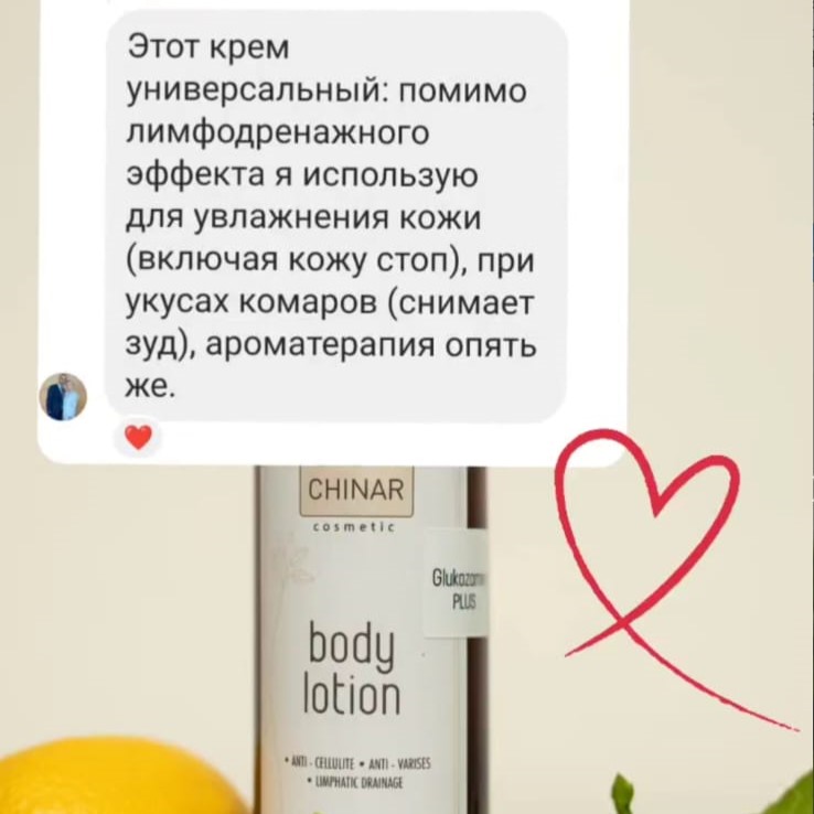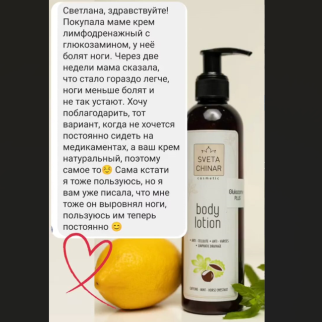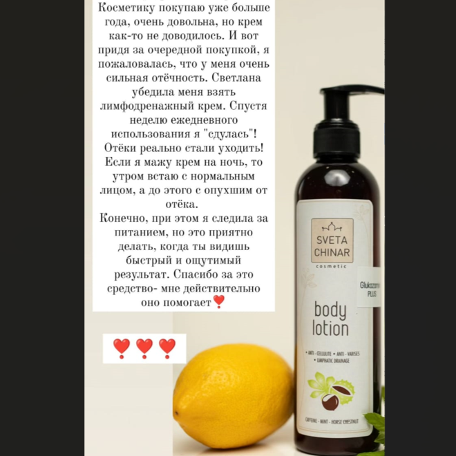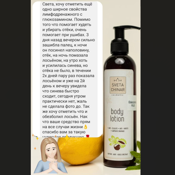 Лосьон для тела. Активный состав обеспечивает не только косметическое, но и терапевтическое действие крема. Оказывает противовоспалительный эффект. Нанося его ежедневно на всё тело, вы снижаете воспалительные процессы в организме. Так же благодаря лимфодренажному действию, вы будете снимать отёк с мест, где есть боль и воспаление. Облегчает состояния при артритах, ревматизмах, суставной и мышечной болях. Как и базовый лосьен обеспечивает лимфоток. Липолитический и антицеллюлитный эффект. Укрепление сосудов. Питание и увлажнение. Крем будет показан всем, старше 50 лет, и тем, у кого повышенная нагрузка на суставы: например, парикмахерам или гидам. Ну и тем, кто много и долго ходит или занимается спортом, а также всем кто хочет совместить терапевтическую пользу и эффект красивого ровного контура тела. |
