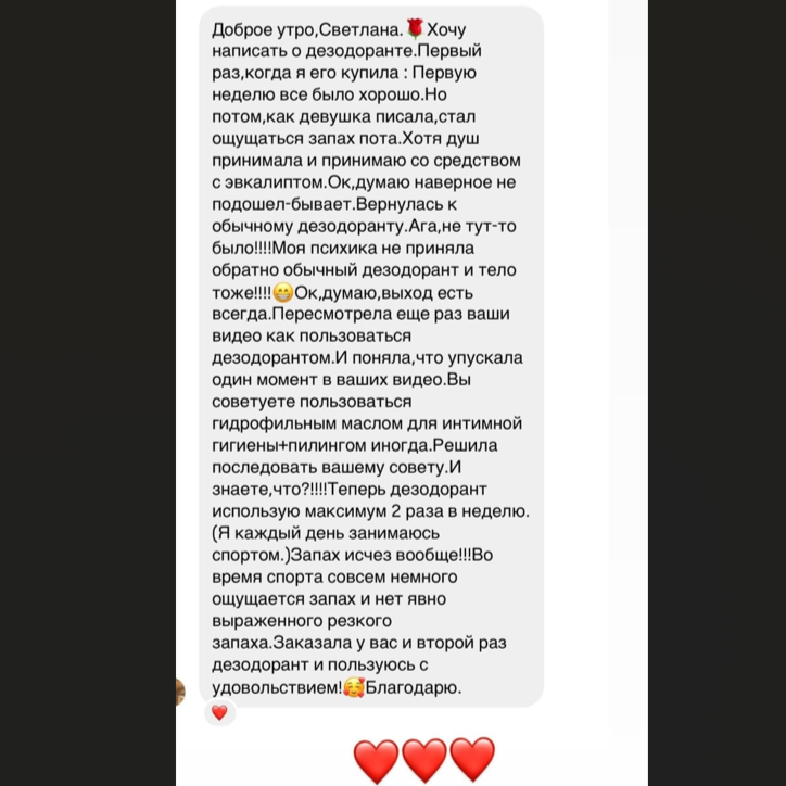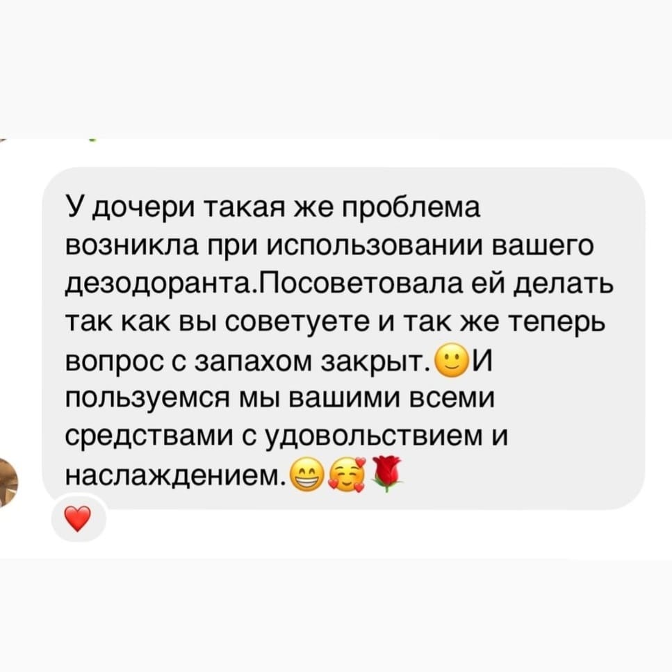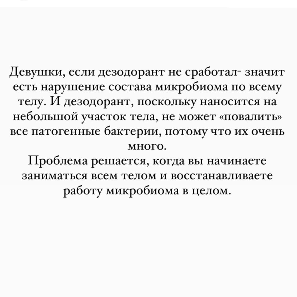 Если по каким то причинам, после использования дезодоранта, запах пота остается все равно, то это повод пересмотреть уход за телом в целом, так как при здоровом микробиоме кожи, запах пота надоло устраняется натуральным дезодорантом. Из наиболее вероятных причин: у вас нарушено состояние микробиома кожи в целом, преобладают патогенные бактерии. Рекомендую пересмотреть очищение в сторону бережного, мягкого - идеально Гидрофильное масло для интимной гигиены или же  Очищающий крем для тела лаванда-эвкалипт .Использовать Лимфодренажный лосьон для тела с глюкозамином и аргинином (производство Республика Беларусь) или Лаванда-ваниль, и на зону подмышек наносить пилинг с АХА ВНА кислотами. Практика показывает, что при соблюдении этих правил, запах пота исчезает.