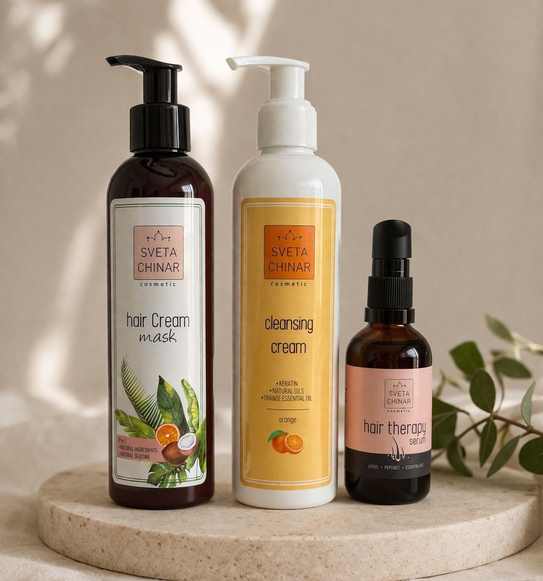 В набор входит: Очищающий крем Апельсин, маска для волос, сыворотка против выпадения и для роста волос с пептидами