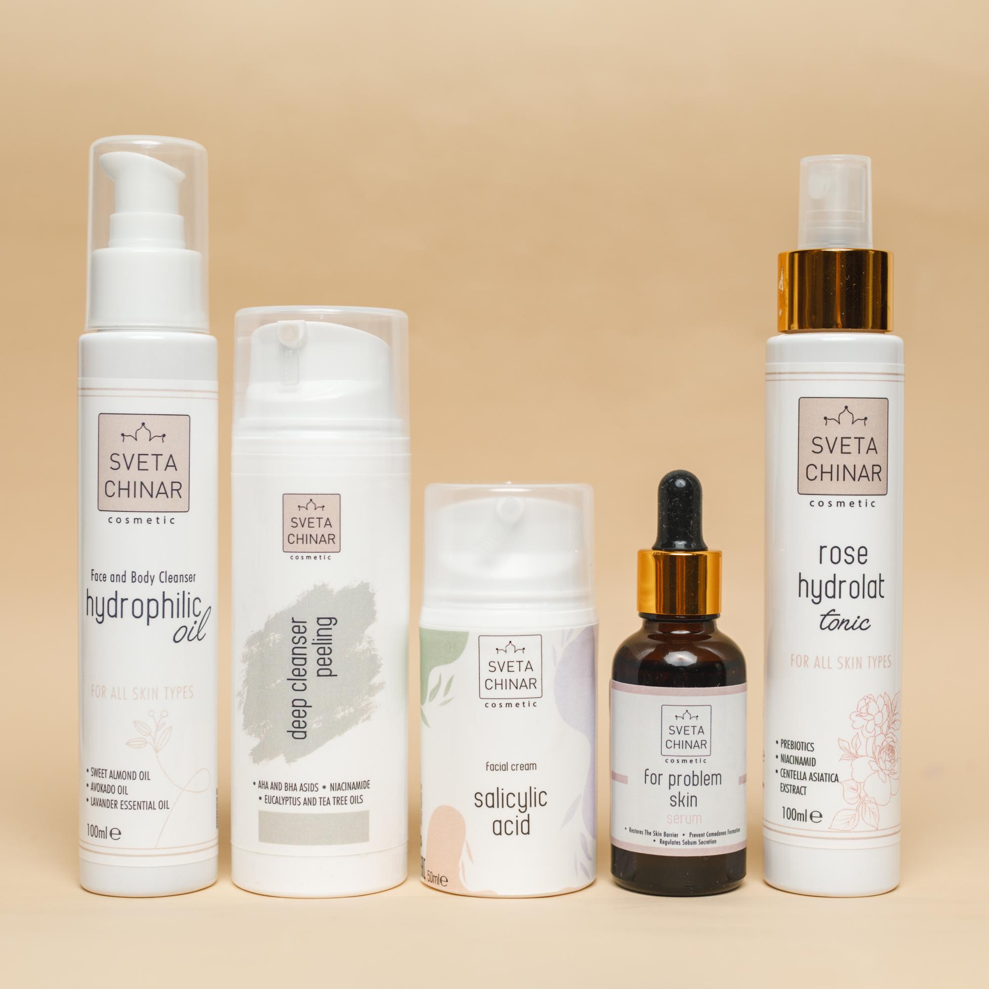Гидрофильное масло 110 мл., Тоник 110 мл., Сыворотка для проблемной кожи, салициловый крем 50 мл, пилинг.